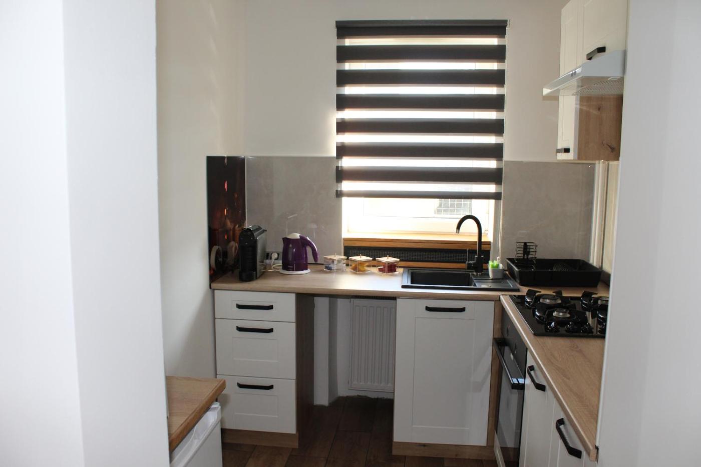 Oferta apartamentu obejmuje sypialnię (1), salon, kuchnię z pełnym wyposażeniem, w tym lodówką i ekspresem do kawy, a także łazienkę (1) z prysznicem oraz suszarką do włosów. W apartamencie zapewniono ręczniki i pościel.