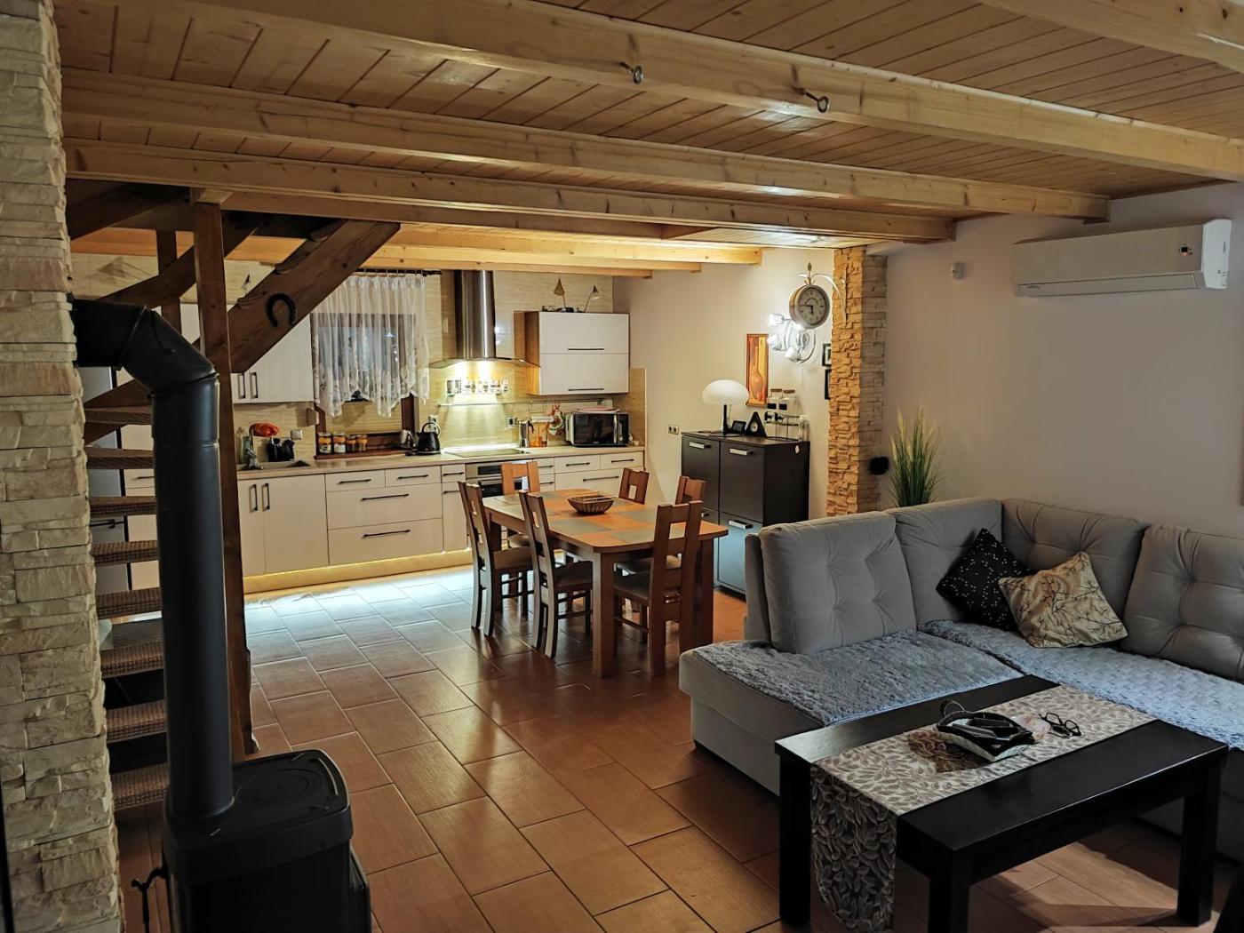 Willa z 2 sypialniami. This villa features a fireplace. Guests will find a stovetop, a refrigerator, kitchenware and an oven in the well-equipped kitchenette. The villa also comes with a barbecue. The villa features air conditioning, a private entrance, a terrace with garden views as well as a shared bathroom boasting a shower. The unit has 6 beds and 1 futon. Willa - 10 osobowy. Powierzchnia pokoju ok.: 100 mkw.
